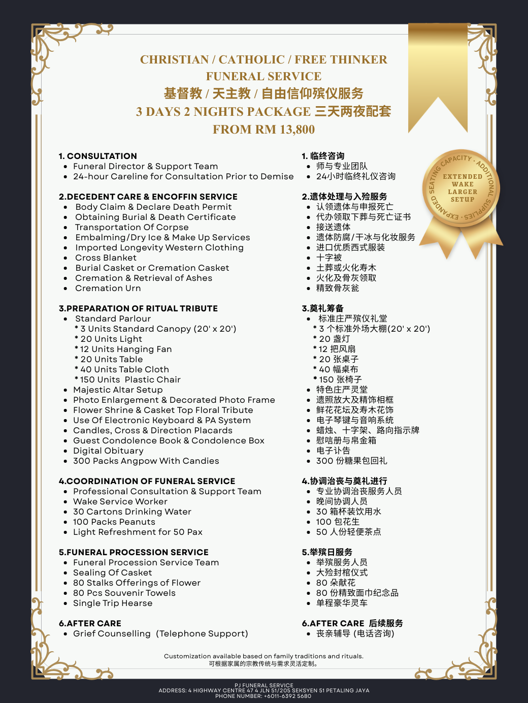 • A transparent Christian funeral package covering body care, ritual preparation, service coordination, and funeral procession within the PJ area.